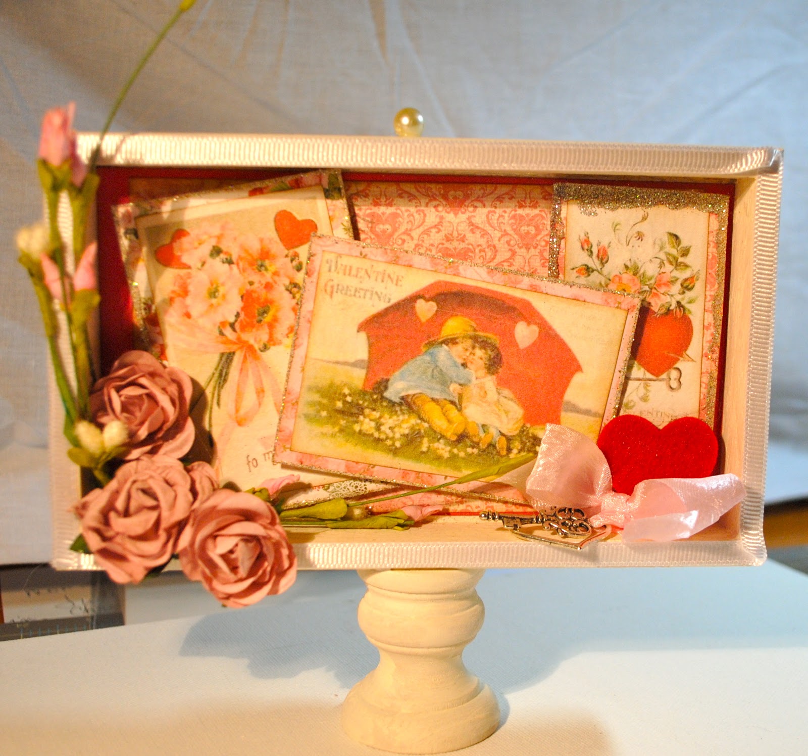 I am delighted. I have made all my Valentine cards and it is not even the 13th yet! I even have the ones to mail completed. Yeah. I handmake about 15 cards for this holiday so it can take a little bit of time. Cardmaking is something I really enjoy. I get to take little bits of goodness and put them all together on a small mat.....wonderful. It's also a way I can use up those little pieces of lace that I just can't seem to part with.
